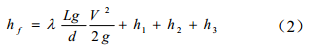 從圖 2可以看出,如果多重起伏管道投水排氣效果非常理想,在此過(guò)程中泵出口的最大阻力應該發(fā)生在水頭翻越靠后的高點(diǎn)時(shí)。其阻力包括沿程摩阻和翻越高點(diǎn)的靜壓力,如方程(1)所示。
