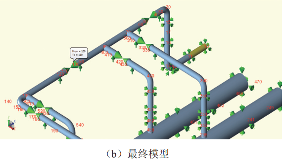 同上,在參數設置界面定義完成土壤參數后,點(diǎn)擊“Concert Input”,CAESAR II軟件自動(dòng)將初始模型轉換成帶土壤約束的最終模型,如圖 3所示。