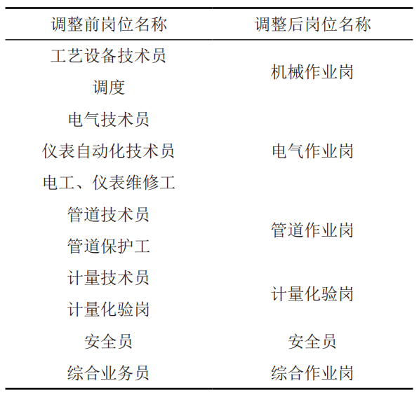 作業(yè)區由原來(lái)側重運行監護轉變?yōu)閭戎鼐S護檢修,實(shí)施無(wú)人值守中間站使50%以上站場(chǎng)調度人員從崗位中解放出來(lái)。為此,公司推行新型崗位體系,簡(jiǎn)化基層崗位設置,將作業(yè)區、維搶修隊的27個(gè)崗位整合為6類(lèi)作業(yè)崗位(表 3),站場(chǎng)主要承擔設備維檢修任務(wù),維搶修隊則更多專(zhuān)注于大中型設備專(zhuān)業(yè)運維,形成以維搶修隊技術(shù)員工與作業(yè)區工程師為中堅力量的維檢修隊伍,站場(chǎng)設備自主維修率不斷提高,作業(yè)區自主運維技能顯著(zhù)提升;鶎涌萍墮C構精簡(jiǎn)64%,用工總量下降36%,人均管道里程由2.47千米提高到5.25千米,人均勞動(dòng)生產(chǎn)率由不到100萬(wàn)元增至550萬(wàn)元。