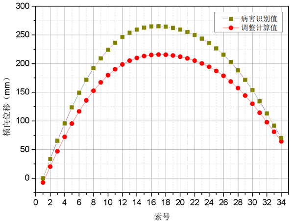 根據最近一次的檢測結果可知,現有結構最大橫向偏位266 mm,發(fā)生在第13#—14#吊桿處。橫向偏位病害識別主要通過(guò)增加單側風(fēng)纜主纜無(wú)應力長(cháng)度來(lái)進(jìn)行,計算結果表明,單側風(fēng)纜主纜無(wú)應力長(cháng)度增加180 mm時(shí),跨越結構主梁橫向產(chǎn)生265 mm位移,識別結果如圖 4所示。