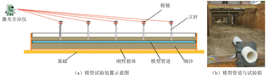 按照圖 2所示的位置將分布式光纖應變傳感器固定在管道上,同時(shí)為了進(jìn)行數據比對,在管道底部增設了1條分布式光纖應變傳感器,共沿管道長(cháng)度方向平行布設了4條分布式光纖傳感器。同時(shí)為了保證光纖監測數據的可靠性,也在模型管道的1/6、1/3、1/2、2/3、5/6長(cháng)度處,在管頂和管底分別等間距布設電阻應變片。在這些位置上,也布置了輕質(zhì)剛性立桿,作為管道關(guān)鍵斷面的變形監測靶點(diǎn),通過(guò)激光全站儀觀(guān)測不同試驗工況下管道的變形狀態(tài)。