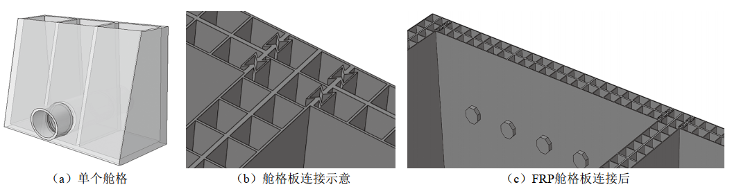 為克服當前截水墻存在的不足,需要開(kāi)發(fā)一種經(jīng)濟合理、施工便捷、材料易取的新型截水墻。東南大學(xué)等[2]提出應用纖維增強復合材料(Fiber reinforced polymer,FRP)的裝配式艙格截水墻專(zhuān)利技術(shù)。FRP艙格截水墻由FRP薄壁艙格和填土兩部分組成,FRP艙格由FRP空腹板通過(guò)膠黏和螺栓連接而成,設計成梯形,用于容納填土,如圖 4所示。填土可采用棄土、廢棄礦渣等價(jià)格低廉填料。