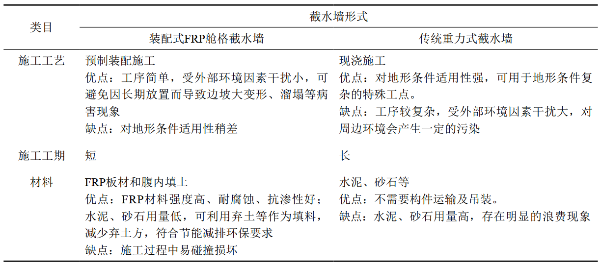 該截水墻的設計荷載與重力式截水墻基本一致,區別是空腹薄壁艙格需考慮箱體內填土的土壓力,這是艙格尺寸設計的主控力,艙格內填土的土壓力可參考貯倉土壓力理論進(jìn)行計算;抗滑、抗傾覆穩定性計算與重力式截水墻相同。裝配式FRP艙格截水墻與傳統重力式截水墻在施工準備、放線(xiàn)、溝壁開(kāi)槽階段工序相同[3],在施工工藝和材料上存在差異,如表 1所示。