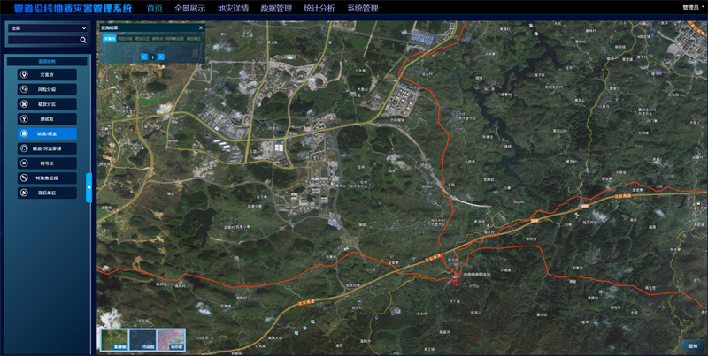 以在線(xiàn)地圖和影像服務(wù)為基礎,通過(guò)應用坐標算法轉換實(shí)現GIS空間數據及常規數據的脫密可視化展示,并提供常規的地圖操作功能。利用圖層控制及多樣的圖例實(shí)現地災點(diǎn)、風(fēng)險段、易發(fā)區、典型地質(zhì)段、高后果區、隧道河流、站場(chǎng)閥室等數據在影像圖、市政圖、地形圖多種底圖上的綜合展示及查詢(xún)。通過(guò)無(wú)人機航拍實(shí)現單一地災點(diǎn)的全景展示,清晰掌握地地質(zhì)災害的發(fā)育、規模、周邊依托、道路交通情況等。