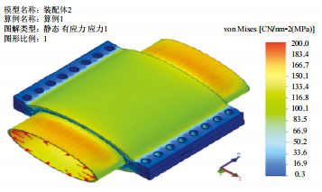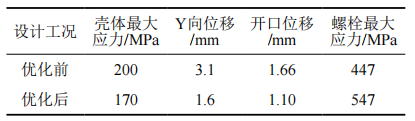 如表 2所示,優(yōu)化后卡具殼體的最大應力有所降低,殼體弧頂的位移明顯減小,開(kāi)口位移減小了34%,螺栓應力有所增高,這是由于殼體壁厚減小后,液壓載荷的作用使螺栓承受較大的拉力,但應力仍小于A(yíng)SME《鍋爐及壓力容器規范VIII》規定的屈服強度?ň咦冃螐埧跐M(mǎn)足密封承壓要求,可達到承壓10 MPa不泄漏的預期指標。
