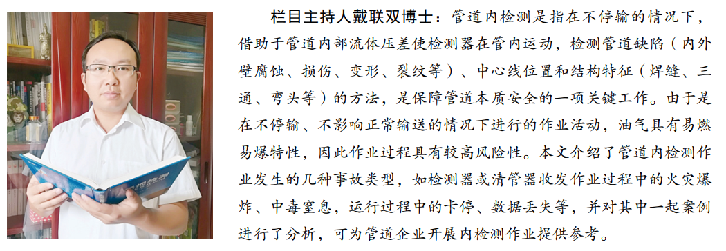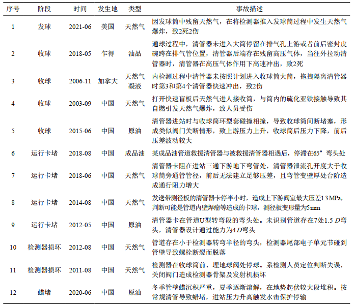 管道內檢測實(shí)施前,應制定適合的內檢測工作流程,包括內檢測技術(shù)與設備選型、檢測器性能驗證、踏線(xiàn)設標、管道清管/測徑、運行檢測器、數據分析和開(kāi)挖驗證,其中清管和內檢測階段風(fēng)險最大。影響檢測器正常運行的因素較多,包括管道收發(fā)球裝置尺寸和結構、管道管徑、三通、閥門(mén)、彎頭和管道壓力、流量以及現場(chǎng)操作等。近年國內外開(kāi)展內檢測(含清管)作業(yè)出現了諸如收發(fā)球過(guò)程中的火災、殘留高壓氣體引起的設備沖撞、運行過(guò)程中的卡停等事故事件(表 1),造成人員傷亡和設備損壞。對此需要引起重視,作業(yè)時(shí)應全面識別項目實(shí)施過(guò)程中存在的風(fēng)險因素,采取消減和控制措施,擬定異常情況的應急處置預案,確保檢測工作順利實(shí)施。