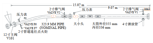 如圖 3所示,收球開(kāi)始,首先關(guān)閉主干線(xiàn)V101隔離閥,通過(guò)放空管點(diǎn)火直到壓力降至698.5 kPa,并從V1處注氮置換直到放空管火焰熄滅。然后關(guān)閉F6和F7并打開(kāi)V2,有少量黑色液體噴出,球筒壓力表P1、P2(量程0~6895 kPa)讀數為0 kPa。從V1移除注氮管并打開(kāi)閥門(mén)繼續放空,打開(kāi)盲板開(kāi)始收球。1#、2#清管器完全進(jìn)入大筒被輕松取出,3#清管器停在變徑段(大小頭)附近、距離球筒口約7.6 m處,現場(chǎng)人員嘗試用9.1 m長(cháng)的牽拉工具將其取出。拖拽過(guò)程中3#、4#清管器快速沖出撞到操作人員,致1人重傷,1人輕傷。同時(shí)黑色液體從V2噴濺而出。