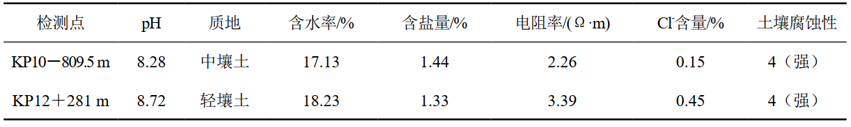 參照GB/T 19285相關(guān)規定,采集的土壤樣品在實(shí)驗室內進(jìn)行pH值、質(zhì)地、含水率、含鹽量、Cl-含量等分析檢測,結合現場(chǎng)測得的電阻率數據,綜合評價(jià)管道各檢測點(diǎn)附近土壤腐蝕性。