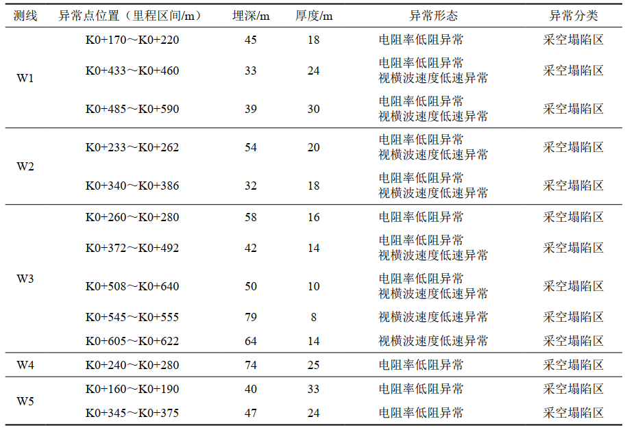 通過(guò)布置5條高密度電法測線(xiàn)和40個(gè)微動(dòng)測試點(diǎn),經(jīng)過(guò)處理和分析,局部地段存在視橫波速度低速帶、電阻率低阻帶等異常,以此推測場(chǎng)區13處物探異常點(diǎn)為采空區位置,如表 1所示。