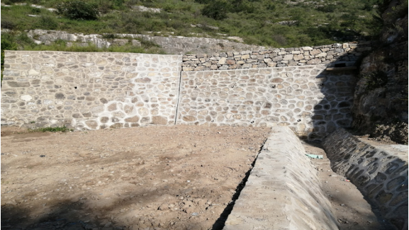 擋土墻是臺田地最常用工程防治措施,可根據現場(chǎng)情況采取混凝土擋墻、漿砌石擋墻與干砌石擋墻或其組合的防護形式(圖 4、圖 5)。針對臺田地覆土層較為松軟地帶,可在原防護基礎之上,修建漿砌石或混凝土排水渠與消力池相結合的方式排放雨水,防止地基下沉、坍塌。