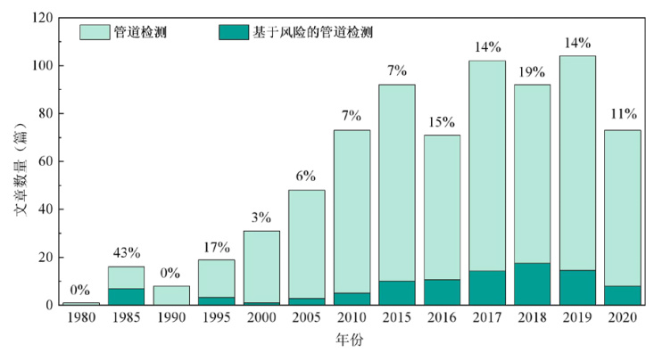 定期檢驗還可根據管道的損傷模式和風(fēng)險水平結合管道使用情況采用基于風(fēng)險的檢驗方法。近年來(lái),在行業(yè)專(zhuān)家及從業(yè)技術(shù)人員的不懈努力下,逐漸形成并完善了基于風(fēng)險的檢驗及完整性管理技術(shù)體系。如圖 1、圖 2所示,據全球文獻統計結果,自2010起,基于風(fēng)險的管道檢測研究占管道檢測研究總量的10%左右,且2018年占比高達19%;陲L(fēng)險的油氣管道相關(guān)研究占油氣管道相關(guān)研究總量的40%,標志著(zhù)基于風(fēng)險的管道檢驗與管道完整性管理理念的一致性已在全球行業(yè)范圍內達成共識,采用基于風(fēng)險的檢驗能更好地將檢驗工作與完整性管理相結合,是管道檢驗行業(yè)的一個(gè)發(fā)展趨勢[1]。我國新建及在役長(cháng)輸管道的基礎數據和運行管理數據齊全,經(jīng)過(guò)多次檢驗后獲取的檢驗數據完整,具備開(kāi)展基于風(fēng)險的檢驗條件。完整性管理是一種基于風(fēng)險的管理方式,本質(zhì)是通過(guò)風(fēng)險識別、檢驗和檢測、修復和風(fēng)險減緩等手段,將管道風(fēng)險控制在合理水平。在國家標準GB/T 37368―2019《埋地鋼質(zhì)管道檢驗導則》中也給出了基于風(fēng)險檢驗的流程和方法。