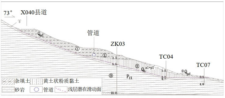 油氣長(cháng)輸管道作為線(xiàn)性工程往往要通過(guò)復雜多變的地質(zhì)環(huán)境,由于管道自身的結構特點(diǎn)和使用壽命等因素,地質(zhì)災害成為影響生產(chǎn)運行安全的一大因素。西氣東輸一線(xiàn)太行山GX005滑坡地質(zhì)災害位于沁陽(yáng)市黃沙嶺,距離市中心約15 km;麦w上部有X040縣道橫坡通過(guò),X040縣道沿坡體向下約30 m處為西氣東輸一線(xiàn)天然氣管道,管道沿坡體中上部橫向敷設,敷設長(cháng)度約為130 m,一旦發(fā)生滑坡可能造成管道變形甚至斷裂,嚴重影響管道運行安全。本文從災害特征分析、滑坡穩定性計算評價(jià)以及防治工程設計等方面入手,采取了有效預測和防治措施。