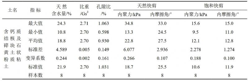 滑坡穩定性評價(jià)與計算中所采用的巖土物理力學(xué)參數的選取,是計算評價(jià)滑坡穩定性的關(guān)鍵所在。在滑體中采取土樣8件進(jìn)行室內試驗,結果統計見(jiàn)表 1。由于試驗土體中夾有大量鈣質(zhì)結核及碎塊石,而試驗時(shí)將其進(jìn)行剔除,導致試驗值產(chǎn)生一定偏差。因此根據現場(chǎng)勘查和室內土工實(shí)驗,坡體各地層的物理力學(xué)參數綜合取值如下表 2所示。