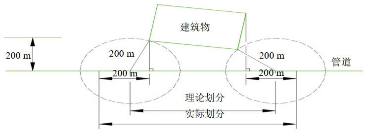居民類(lèi)構建筑物具體確定高后果區邊界時(shí),按照規范要求,應在管道中心線(xiàn)上畫(huà)一個(gè)200 m半徑的圓,當圓弧與構建筑物相接時(shí),圓心距為高后果區的長(cháng)度,如圖 2中理論劃分。這樣的識別方法嚴謹,但實(shí)際操作難度很大,需將管道路由、構建筑物和兩者相對關(guān)系嚴格按比例繪圖,再用上述辦法畫(huà)圓,按比例推算圓心位置,確定高后果區長(cháng)度。在建設期識別時(shí)有圖紙可依托,基本可實(shí)現,但在運行期當構建筑物與原設計圖紙發(fā)生變化后,生產(chǎn)運行單位需要重新調繪管道周邊信息,按照比例繪制圖紙,精度要求高,難度大,不易實(shí)現。