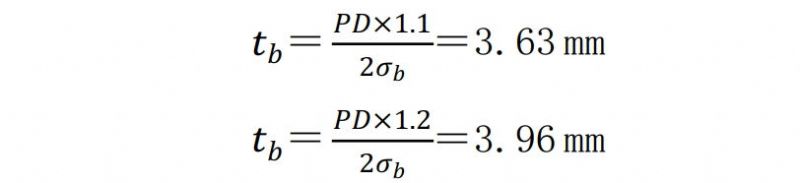 實(shí)際上,管道屈服以后管徑不斷增大。假設按管道10%和20%延伸率分別進(jìn)行計算,則管道爆裂的剩余壁厚分別為: