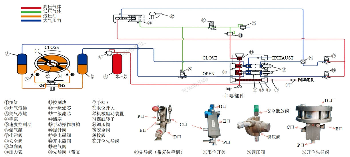 在ESD觸發(fā)時(shí),帶紅色手柄的復位先導閥20關(guān)閉,C口和E口導通,與開(kāi)位先導閥27以及限位開(kāi)關(guān)21連接的先導氣從E口泄放掉,開(kāi)位先導閥27在失去先導氣的情況下,P口和C口斷開(kāi),鎖定開(kāi)閥氣路。限位開(kāi)關(guān)21在缺失先導氣的情況下,閥芯向右移動(dòng),P口與C口導通,紅色高壓氣體經(jīng)過(guò)梭閥26進(jìn)入提升閥組件,高壓氣體推動(dòng)提升閥活塞向左移動(dòng),錐形密封打開(kāi),高壓氣體進(jìn)入關(guān)氣液罐,推動(dòng)液壓油流向開(kāi)液壓罐,擺缸轉子在液壓油的驅動(dòng)下帶動(dòng)球閥閥桿執行關(guān)閥操作。當閥門(mén)關(guān)到位后,擺缸上的機械驅動(dòng)裝置頂住限位開(kāi)關(guān)22,利用機械力的方式使P口和C口斷開(kāi),關(guān)閥結束。