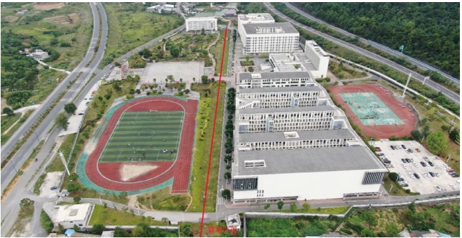 西南成品油管道某管段管徑457 mm,管道材質(zhì)X60,設計壓力10 MPa,防腐層為3PE,2005年投產(chǎn)運行。由于地方經(jīng)濟建設和城市發(fā)展,縣城區逐步將管道包圍,形成人口密集型高后果區10處(其中學(xué)校2處、安置區4處、物流商貿城2處、廠(chǎng)區2處)。例如,某校園教學(xué)樓和宿舍樓建筑物距管道最近距離15 m,涉及管道長(cháng)度450 m,宿舍為6層樓,教學(xué)樓為5層,建筑面積54 000 m2,校園師生3463人,為Ⅲ級人口密集型高后果區(圖 1)。