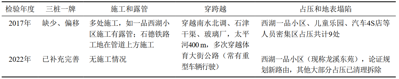 (1)宏觀(guān)檢查。2017年宏觀(guān)檢查發(fā)現管道沿線(xiàn)人員、車(chē)輛活動(dòng)頻繁,有直接占壓9處,部分“三樁一牌”缺少和偏移。2022年宏觀(guān)檢查發(fā)現管道周?chē)藛T活動(dòng)依舊頻繁,但大部分占壓已清理拆除,占壓嚴重的西湖一品小區(現稱(chēng)龍溪東苑)管段正在規劃新路由準備改線(xiàn),管道標識已補充完善。宏觀(guān)檢查結果如表 1所示。