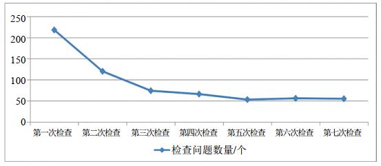 (3)管控成效。應用帕累托圖法對影響焊接質(zhì)量的主要因素進(jìn)行重點(diǎn)管控,經(jīng)第七次焊接質(zhì)量檢查,累計問(wèn)題項已降低至55個(gè),如圖 2所示。建設單位在未增加管理人員情況下,焊接質(zhì)量問(wèn)題總體呈下降趨勢,如圖 3所示。