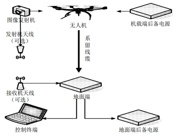 (2)長(cháng)時(shí)滯空視頻監控。普通旋翼無(wú)人機在空中停留時(shí)間過(guò)短,致使連通性、移動(dòng)性和大容量之間相互矛盾,系留多旋翼無(wú)人機小巧輕便,在100 m高度系留懸停時(shí)仍有10 kg以上的載荷搭載能力,并且采用地面電源持續供電工作,沒(méi)有續航時(shí)間限制,而且開(kāi)設迅速、無(wú)需空域申請、操作保障簡(jiǎn)單,是一個(gè)非常好的監控通訊平臺。有效地解決搶險救援中覆蓋、移動(dòng)和大容量之間的矛盾。其結構如圖 2所示。