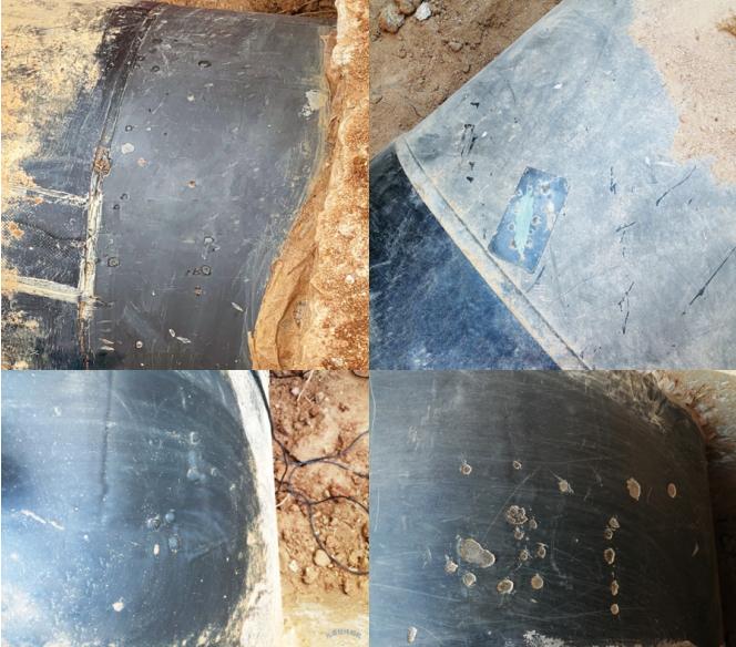 (3)防腐層破損情況。開(kāi)挖后發(fā)現3處防腐層破損點(diǎn),現場(chǎng)清理檢查有一處破損點(diǎn)在固定墩兩側,一處在彎頭處,一處位于直管段,其中最大一處破損點(diǎn)20 mm×10 mm,局部有氣泡(圖 1),且管道本體都未發(fā)生腐蝕。通過(guò)現場(chǎng)檢查,管線(xiàn)鋪設施工過(guò)程中,可能因施工方法不當、操作不規范造成固定墩兩邊防腐層缺陷,彎頭部位受到異物或其他物體影響造成防腐層破壞。