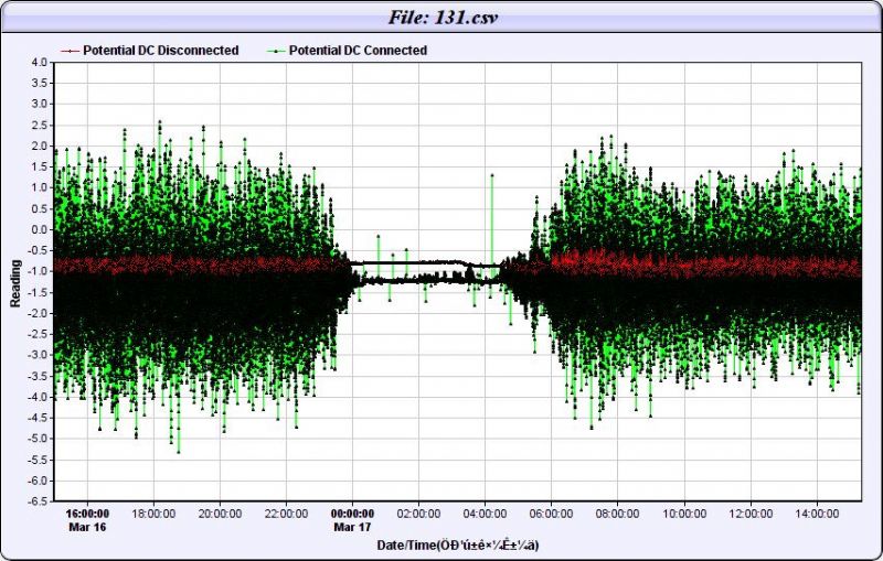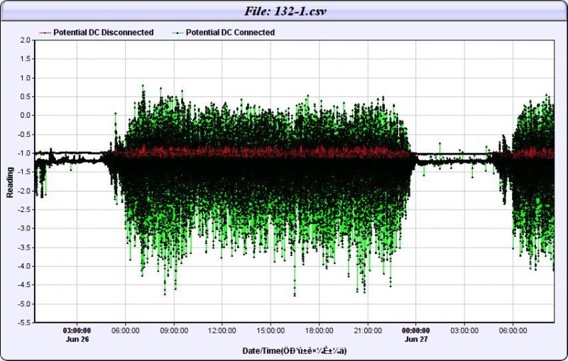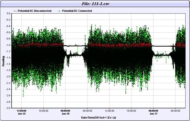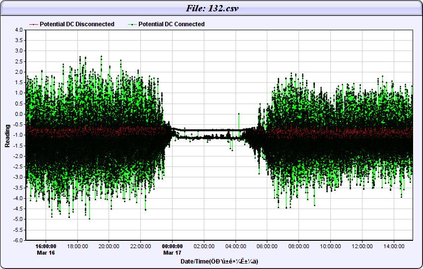 排流施工結束后,依舊采用UDL-2對管道長(cháng)時(shí)間通/斷電位進(jìn)行監測,以此判斷排流地床有效性有了明顯改善(圖 3)。安裝排流地床后,3處測試樁斷電電位曲線(xiàn)明顯下移,電位正于﹣850 mV的電位占比低于5%,說(shuō)明排流地床設計、施工達到預計要求。