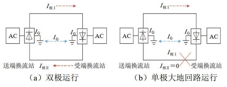 正常情況下,高壓直流輸電系統主要采用雙極運行方式實(shí)現遠距離輸電。如圖 1(a)所示,極Ⅰ、極Ⅱ回路電流數值基本相等但方向相反,即使設備整流運行的差異導致極Ⅰ和極Ⅱ間存在一定的不平衡電流(通?刂圃谳斔碗娏鞯1%以?xún)龋,由于接地極通常設置在遠離管道設施的位置,這一數量級的不平衡電流不會(huì )對油氣管道造成明顯的直流干擾。