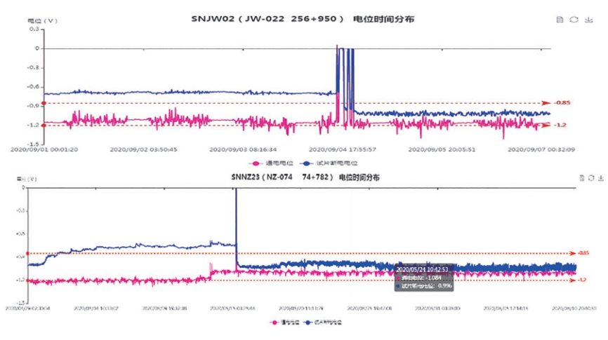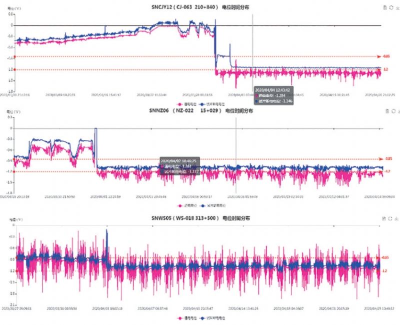 鋼制埋地輸油管道智能測試樁為管道保護提供了數據基礎,但測試樁故障會(huì )造成陰保數據不準確,F場(chǎng)實(shí)踐證明,不同部件的失效在電位曲線(xiàn)圖上會(huì )呈現不同的變化規律。做好智能測試樁樁體、智能采集儀、電源、參比電極、試片等零部件的故障排查與維護,對保證電位數據的真實(shí)性具有重要的意義。