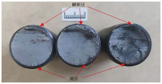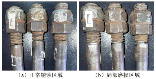 斷口呈典型疲勞斷裂特征,斷口平齊。斷口表面存在三個(gè)特征區域:疲勞源區、裂紋擴展區和瞬斷區[2]。疲勞源區位于螺栓外表面,較為集中;擴展區光滑且有橫紋,面積較大;瞬斷區位于疲勞源區對面。通過(guò)對比分析失效螺栓螺桿外表面和斷口啟裂位置,可以發(fā)現3件失效螺栓的疲勞源區位置螺桿外表面為正常銹蝕狀態(tài),而疲勞斷口的瞬斷區螺桿外表面存在局部磨損(圖 3)。