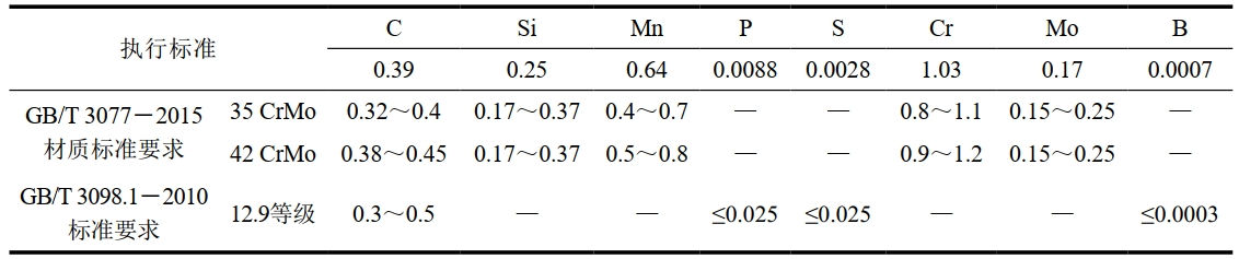 化學(xué)成分分析。依據GB/T 3098.1―2010產(chǎn)品標準對3件失效螺栓桿體進(jìn)行取樣化學(xué)成分分析,試驗標準為GB/T 4336―2016《碳素鋼和中低合金鋼 多元素含量的測定 火花放電原子發(fā)射光譜法(常規法)》,分析設備為ARL4460直讀光譜儀。參照GB/T 3077―2015《合金結構鋼》標準要求,該批螺栓桿體應為合金結構鋼,材質(zhì)介于35 CrMo和42 CrMo之間,為40 CrMo。螺栓化學(xué)成分分析結果符合GB/T 3098.1—2010標準中10.9和12.9緊固件性能等級要求(表 1)。