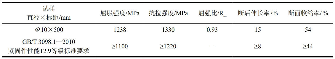 拉伸試驗。在螺栓桿體上沿縱向取圓棒狀試樣進(jìn)行拉伸性能試驗,試樣標距段直徑為10 mm,標距段長(cháng)度為50 mm。試驗在UTM5305材料試驗機上進(jìn)行,執行GB/T 228.1―2021《金屬材料 拉伸試驗 第1部分:室溫試驗方法》,參照GB/T 3098.1—2010進(jìn)行結果比對,符合標準中12.9緊固件性能等級要求(表 2)。