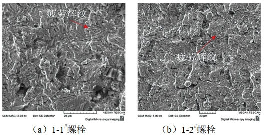 采用TESCAN VEGAⅡ掃描電子顯微鏡對斷口(圖 6)進(jìn)行分析,擴展區較為整齊且有橫紋,瞬斷區出現小塊缺失,斷口呈典型疲勞斷裂特征。1-1#螺栓斷口源區為螺紋齒底位置,1-2#螺栓斷口源區內存在多條棘輪花樣(圖 7)。兩個(gè)樣品的擴展區均存在明顯的疲勞輝紋(圖 8)。