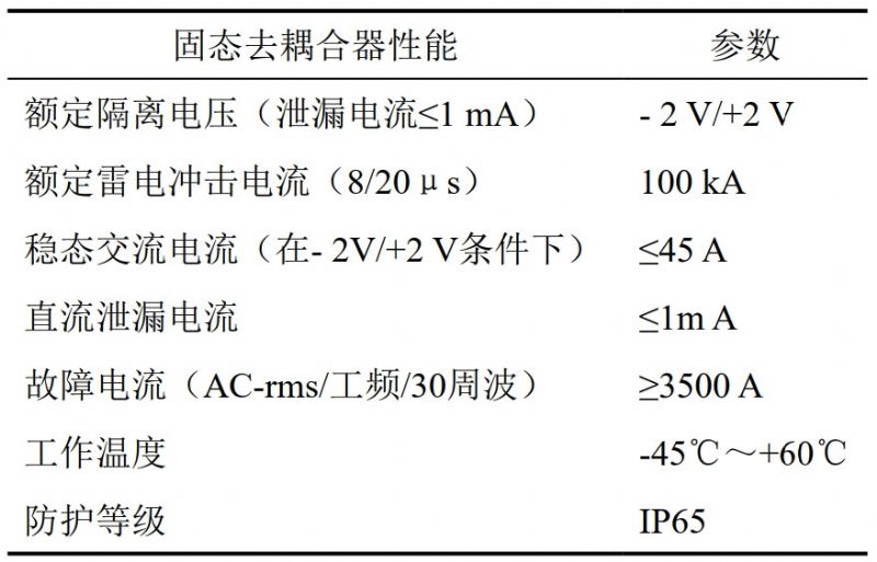 (2)固態(tài)去耦合器的選擇。作為直流隔離和交流導通裝置,當兩個(gè)端子之間的電壓超過(guò)直流導通閾值時(shí),固態(tài)去耦合器呈現直流低阻抗導通模式;當兩個(gè)端子之間的電壓降低到直流導通閾值以下時(shí),固態(tài)去耦合器重新對直流電流呈現高阻抗,切斷直流電流。固態(tài)去耦合器在遇到故障電流或雷擊電流沖擊時(shí),內部模塊能瞬間導通,將干擾電流通過(guò)接地泄放入大地,從而起到了對管道設施和人員保護的作用(表 1)。