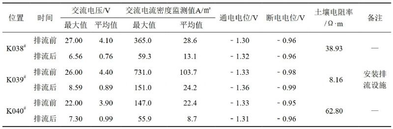 檢測評價(jià)排流后效果,包括設施檢查、接地極接地電阻測試、接地極電位測試、排流量測試等。通過(guò)檢測數據分析(表 2),管道K039#測試樁處安裝排流設施后,交流電壓平均值由4.4 V降至0.89 V,交流電流密度平均值由103.7 A/m²降至24.2 A/m²。K038#—K040#管段的交流電流密度平均值均小于30 A/m²,其余臨近管道位置的交流電壓及交流電流密度均達到排流防護效果;地床電阻0.88Ω,小于4 Ω,交流排流量在476 mA~578 mA,排流地床開(kāi)/閉合電位無(wú)變化;管道排流器安裝前后,所涉及管段的斷電電位均在﹣0.95 V~﹣0.99 V,陰保正常。