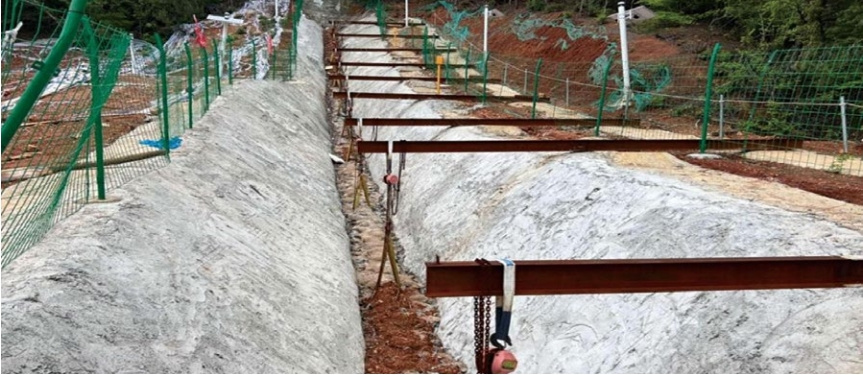 (4)懸吊管道穩管。采用懸臂梁吊拉,利用管道處在滑坡邊緣的有利條件,將支撐梁和抗力梁設置在穩定的坡體上(圖 3)。