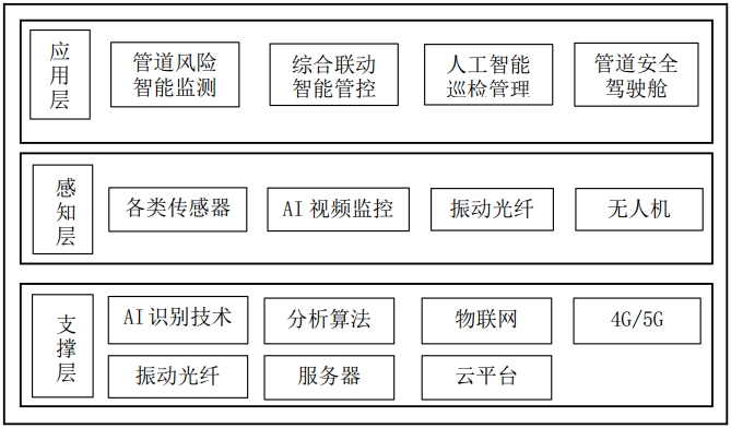 (5)基于大數據、物聯(lián)網(wǎng)、云計算、人工智能等技術(shù),底層搭建智能管控一體化平臺架構,打通各類(lèi)智能感知終端、振動(dòng)光纖預警、AI視頻監控和無(wú)人機場(chǎng)等系統平臺接口,利用數據倉庫技術(shù),對各類(lèi)異構數據源進(jìn)行有效集成。通過(guò)AI自動(dòng)識別和自動(dòng)分析,設計感知觸發(fā)事件邏輯程序,實(shí)現各系統之間的有效融合,最終實(shí)現多方位感知、綜合性預判、自適應優(yōu)化、一體化管控的管道智能管控一體化系統平臺。