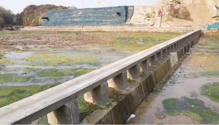 工程保護。河道北側邊坡采用D159 mm鋼管樁支護;露管段管道東側約5 m處設置生態(tài)袋擋土墻一道,擋土墻至東側坡體采用生態(tài)袋恢復,表層生態(tài)袋裝填有本土易生長(cháng)的草籽。生態(tài)袋邊坡碼砌前將溝內應急處理時(shí)的袋裝土清除,淤泥土采用三七水泥土換填,換填后表層鋪設防滲膜。河道北側設置格賓石籠擋墻一道,河道南側陡坎位置設置格賓石籠擋墻一道。河道內管道下游,垂直河道方向設置混凝土防沖墻,防沖墻頂設置巡檢通道,下游設置混凝土跌水,設置混凝土過(guò)水面(圖 3)。