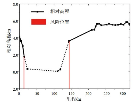 對該集輸管線(xiàn)的10個(gè)管道進(jìn)行高程測試,測試的總長(cháng)度為6.414 km;诠芫(xiàn)的高程測試數據,根據式(1)和式(2)計算求得管線(xiàn)實(shí)際坡度隨里程的變化(圖 1)。其中,管線(xiàn)穿越水域部分的相對高程用虛線(xiàn)表示。