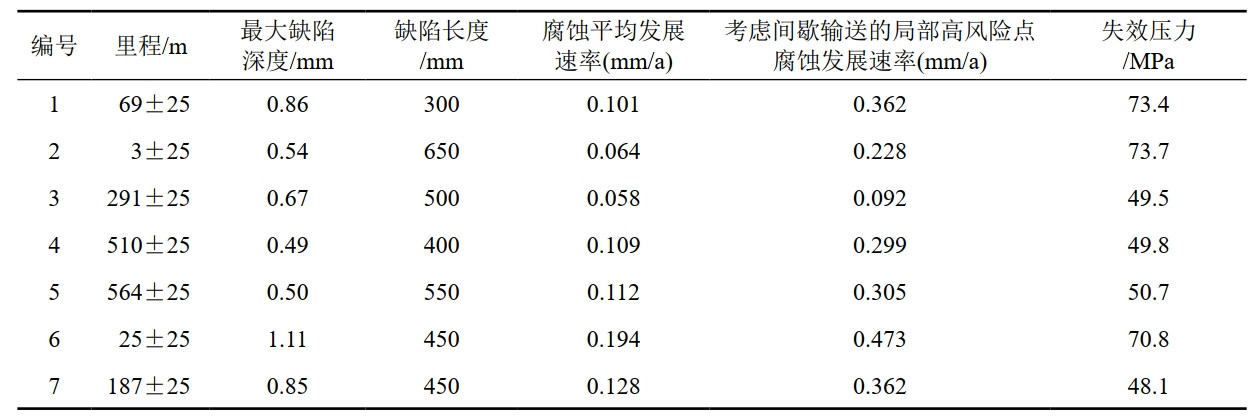 基于4.1小節得到的管道腐蝕發(fā)展速率和管道失效壓力,可以計算出各條管線(xiàn)在考慮間歇輸送的局部高風(fēng)險點(diǎn)腐蝕發(fā)展速率情況下的剩余壽命。結果表明,7條目標管線(xiàn)的剩余壽命均為20年。