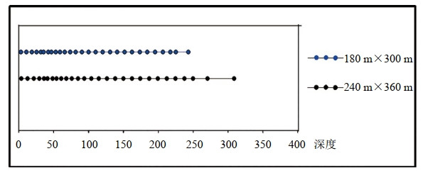 發(fā)射線(xiàn)框。線(xiàn)框邊長(cháng)會(huì )直接影響勘探深度,在相同頻率下,線(xiàn)框邊長(cháng)越大,探測深度越深。根據已知地質(zhì)資料可知,勘探區內目的層埋深約250 m左右。發(fā)射線(xiàn)框為180 m×300 m和240 m×360 m時(shí)觀(guān)測得到的響應曲線(xiàn),當發(fā)射線(xiàn)框尺寸為240 m×360 m時(shí),在響應曲線(xiàn)尾支更平滑。通過(guò)數據處理得到深度示意圖(圖 2),發(fā)射邊框180 m×300 m時(shí),探測深度小于250 m;發(fā)射邊框為240 m×360 m時(shí),能滿(mǎn)足探測深度,因此為了保證感應場(chǎng)強度,故選用240 m×360 m發(fā)射邊框進(jìn)行工作。