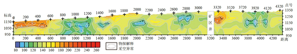 綜合已有地質(zhì)資料與物性資料對每條測線(xiàn)進(jìn)行數據處理和解釋?zhuān)F以L(fǎng)120測線(xiàn)為例進(jìn)行解釋說(shuō)明。L120測線(xiàn)瞬變電磁反演結果(圖 4)中,該測線(xiàn)探測范圍內地下存在7處異常區。其中點(diǎn)號0 m~540 m發(fā)現相對高阻反應,根據異常所在標高1050 m~1100 m處,結合資料分析推斷為新田煤礦5-1煤層采空,致使該處電阻率偏高于周?chē)鷰r性;在點(diǎn)號3260 m~3380 m發(fā)現相對高阻反應,根據異常所在標高1200 m~1250 m處,結合資料推斷為西岔溝煤礦3-1煤層采空,致使該處電阻率偏高于周?chē)鷰r性;在點(diǎn)號800 m~1240 m、1400 m~1560 m、1960 m~2100 m發(fā)現相對低阻反應,根據異常所在標高1050 m~1100 m處,結合資料分析推斷為新田煤礦5-1煤層圍巖富水或采空區局部含水引起;在點(diǎn)號2620 m~2860 m和3740 m~4100 m發(fā)現相對低阻反應,根據異常所在標高1150 m~1250 m處,結合資料推斷為西岔溝煤礦3-1煤層采空充水或泥質(zhì)充填后所引起。