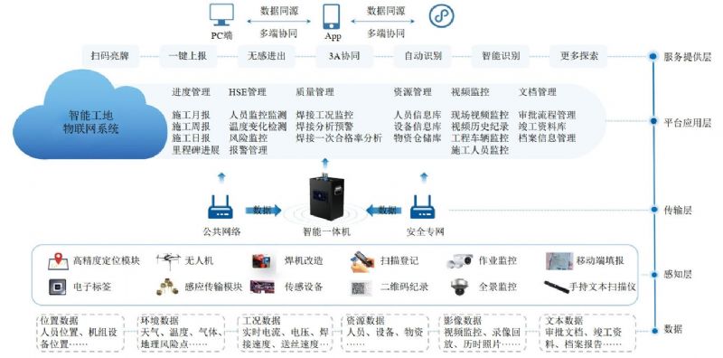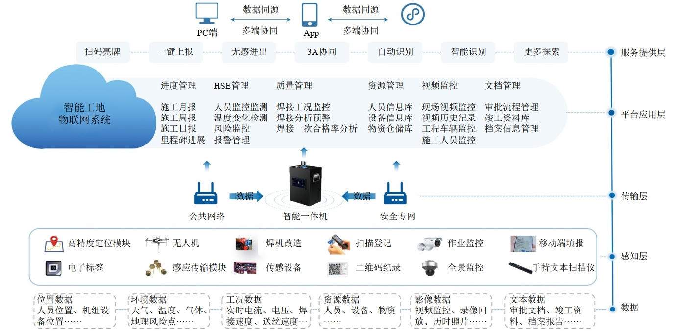 在施工現場(chǎng)通過(guò)智能一體機部署無(wú)線(xiàn)局域網(wǎng),結合二維碼、電子標簽、無(wú)人機、檢測儀、焊機、攝像頭、移動(dòng)終端等,實(shí)現對位置、環(huán)境、工況、資源、影像、文本數據的前端感知和數據采集,真實(shí)準確反映現場(chǎng)作業(yè)過(guò)程,提高過(guò)程管控能力,確保工程建設質(zhì)量。