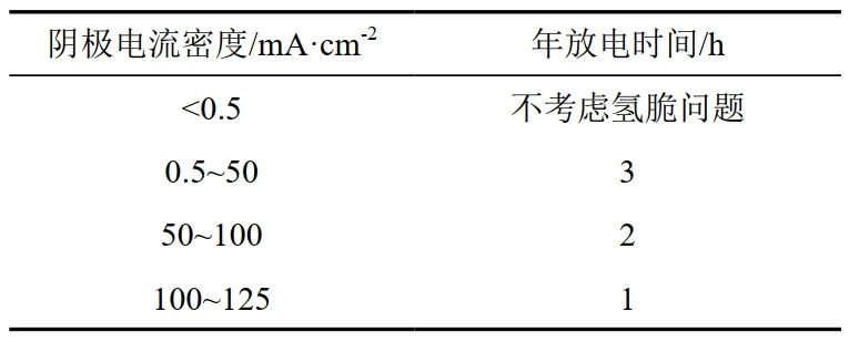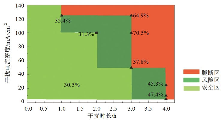 獲得高壓直流干擾電參數、環(huán)境因素等對氫脆的影響規律,確定放電時(shí)不同電流密度下,接地極年放電時(shí)間的限制,形成高壓直流干擾氫脆控制安全邊界(表 2、圖 2),當干擾時(shí)長(cháng)和干擾電流位于圖譜紅色區間時(shí),X80鋼具有氫脆風(fēng)險。