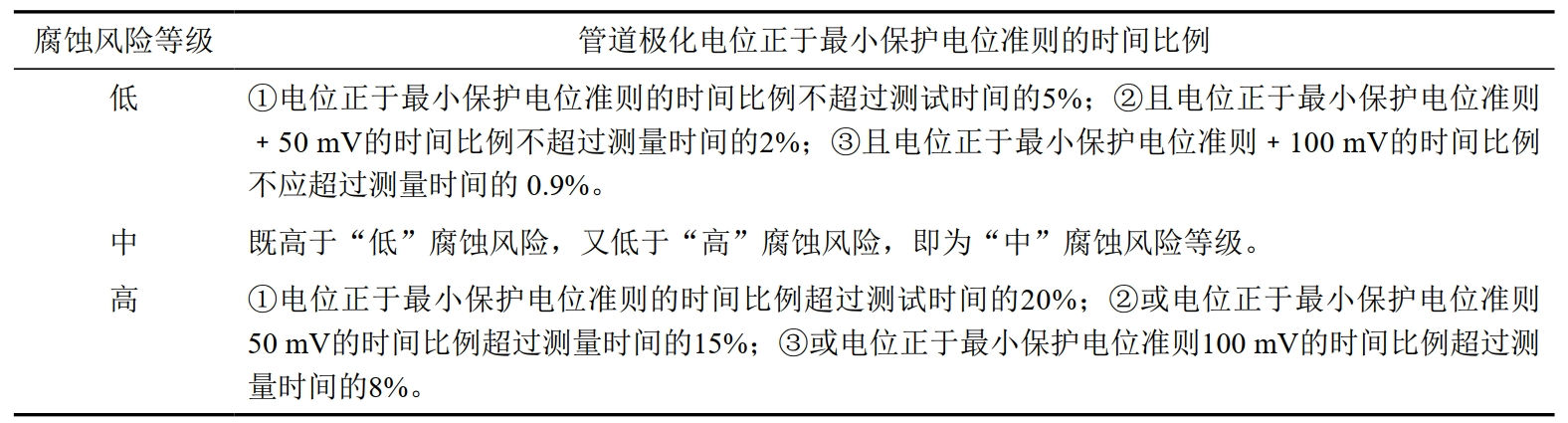確定動(dòng)態(tài)直流干擾評價(jià)方法。在動(dòng)態(tài)直流雜散電流干擾下的腐蝕風(fēng)險采用管道極化電位相對于在該環(huán)境中管道陰極保護電位準則偏移量及時(shí)間比例進(jìn)行判斷。