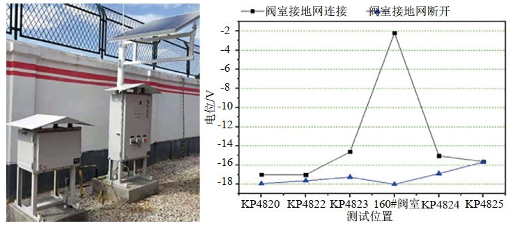 線(xiàn)路管道采取絕緣接頭分段和鋅帶排流的防護方案,有效降低了管道沿線(xiàn)干擾電壓和腐蝕速率。在站場(chǎng)閥室研發(fā)了大功率排流器,實(shí)現了管地間高電壓等電位處理。排流器最大排流量可達240 A,并具備管地電壓自動(dòng)監測和超壓時(shí)等電位連接功能,可消除站場(chǎng)閥室放電燒蝕風(fēng)險,F場(chǎng)實(shí)施后有效降低了站場(chǎng)閥室燒蝕和線(xiàn)路管道腐蝕風(fēng)險(圖 3~圖 5)。