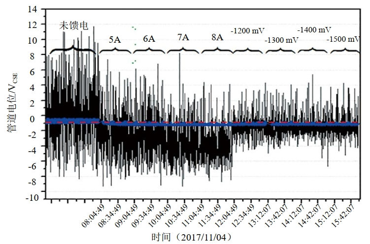 對地鐵等動(dòng)態(tài)直流干擾采用強制電流陰極保護和極性排流聯(lián)合防護方式,有效減少雜散電流流入,全線(xiàn)電位水平均得到改善。陰保系統在恒位、恒流工作模式下,通電電位波動(dòng)幅值減小,斷電電位明顯負向偏移,陰極保護有效(圖 6)。