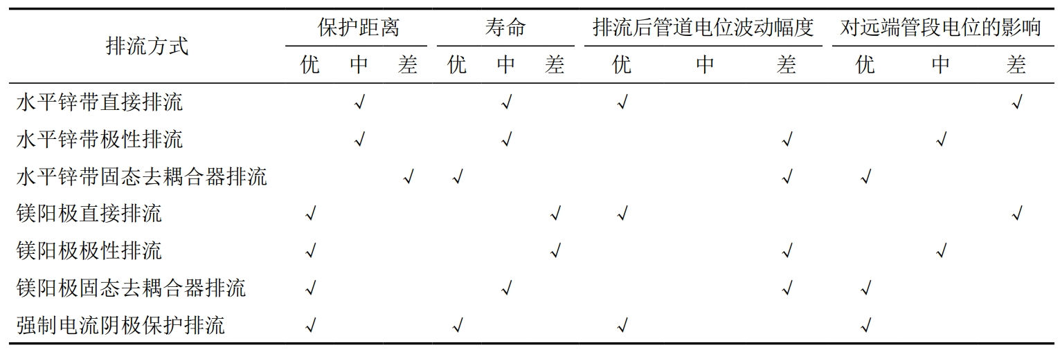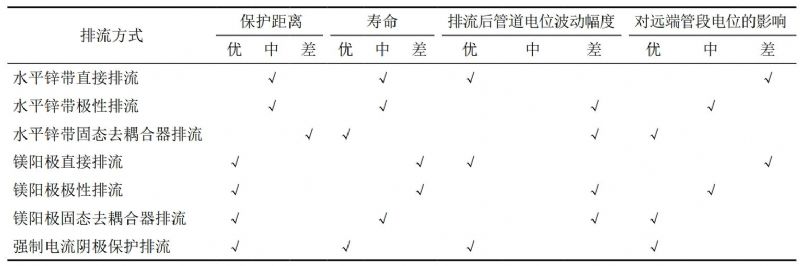 采用現場(chǎng)排流試驗測試研究了不同排流地床和排流器組合下的排流效果,明確了交直流交互作用工況下有效的緩解措施及其作用范圍,強制電流陰極保護排流可在較長(cháng)距離范圍內有效抑制動(dòng)態(tài)直流干擾,對于動(dòng)態(tài)直流干擾治理效果最佳,但對于交流干擾改善不理想。犧牲陽(yáng)極接地排流不適合動(dòng)態(tài)正向干擾強度高的情況下,犧牲陽(yáng)極接地排流可在有限的范圍內對交流和直流干擾有一定程度的緩解。其中鋅帶直接排流時(shí)管道保護效果較差,而采用鎂帶直接排流時(shí)管道陰極保護全時(shí)刻達標。排流地床不同連接方式時(shí),直接排流的效果優(yōu)于極性排流,極性排流優(yōu)于固態(tài)去耦合器排流。三種連接方式下,遠端管道電位均無(wú)正向偏移;讷@得的防護措施適用性和有效作用范圍研究成果,明確了單一的排流方式均存在一定的弊端,在實(shí)際的工程應用中應根據實(shí)際需求針對性選用綜合控制措施,確保排流效果(表 4)。