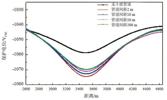 圖 2 不同管道間距下保護電位隨距離的變化曲線(xiàn)