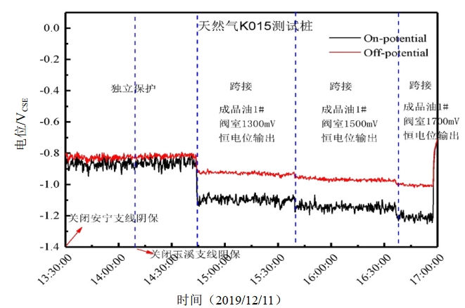 可以看出,跨接前后測試樁通斷電電位變化顯著(zhù)。相比C站干線(xiàn)陰極保護系統上下游多套陰極保護系統相互影響,B原油支線(xiàn)和F天然氣支線(xiàn)陰極保護系統較為單一,跨接試驗前后已將其關(guān)閉,因此跨接后B原油支線(xiàn)、F天然氣支線(xiàn)和成品油干線(xiàn)電位變化顯著(zhù)。當1#成品油閥室恒電位輸出1300 mV時(shí),K016測試樁處B原油支線(xiàn)、F天然氣支線(xiàn)和成品油干線(xiàn)電位均能滿(mǎn)足標準要求,其有效保護范圍約3 km,并且管道沿線(xiàn)K019和K022測試樁處仍然有一定保護效果,但其管道斷電電位已經(jīng)不滿(mǎn)足標準﹣850 mV準則。繼續增大1#成品油閥室輸出至1500 mV和1700 mV,靠近跨接點(diǎn)的B原油支線(xiàn)、F天然氣支線(xiàn)和成品油干線(xiàn)K015和K016測試樁處陰極保護效果有部分提升,但遠離跨接點(diǎn)的K019和K022測試樁保護效果無(wú)明顯提升。其結果說(shuō)明跨接能有效提升原本陰極保護水平較差的F天然氣支線(xiàn)的陰極保護效果,但是單靠單點(diǎn)的跨接作用的范圍較為有限,無(wú)法使管道沿線(xiàn)電位均達到標準要求。