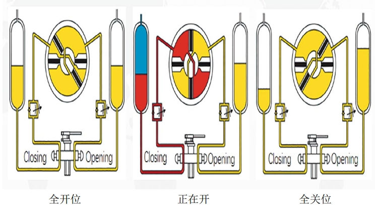 擺缸處于全開(kāi)位,液壓油無(wú)壓力,執行器無(wú)旋轉動(dòng)作;執行器順時(shí)針?lè )较蛐D,高壓液體進(jìn)入關(guān)入口,壓力補償通道使得兩關(guān)閉腔體同步受壓,此時(shí),執行器產(chǎn)生完全平衡的扭矩,推動(dòng)葉片轉動(dòng)。一旦執行器到達全關(guān)位,液壓油壓力通過(guò)執行器自身控制得到釋放(圖 2)。